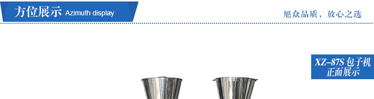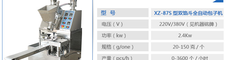 XZ-87S型雙餡斗全自動包子機,可生產各種肉包、肉菜包、菜包、小籠包、湯包、水晶包、圓饅頭、奶黃包、豆沙包、叉燒包、南瓜餅等幾十種包餡制品。適用于賓館、飯店、學校、機關企業食堂、饅頭或包子加工廠、早餐工程店及速凍食品廠等單位。可滿足不同客戶群體。免費提供工藝技術。免費上門培訓指導安裝。