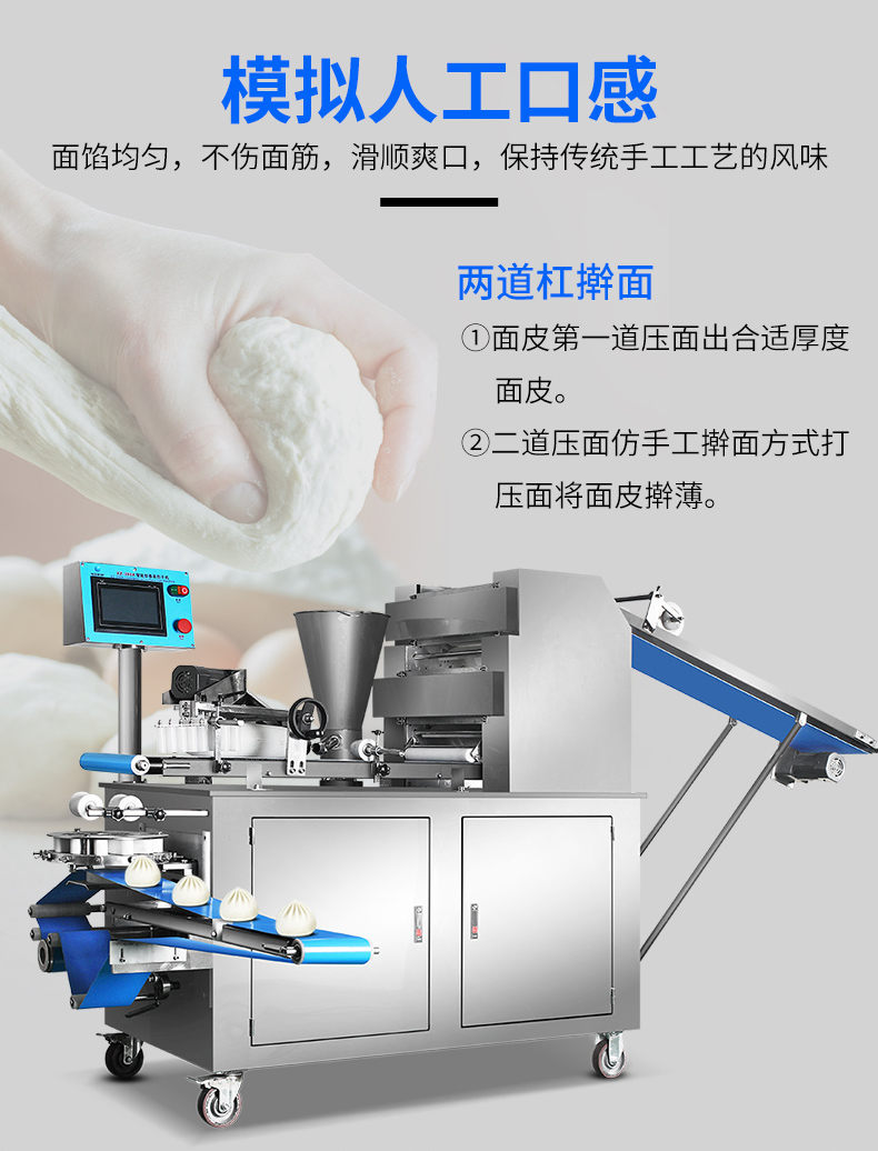 XZ-290A智能型卷面包子機,仿手工智能包子機。操作簡單、精準控制、快速成型、模擬人工。好機器,表里如一,專注品質機器,客戶現場試機。一臺包子機輕松解決手工和面/包餡/人工效率低,用人成本高等一系列問題。