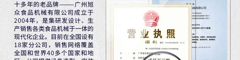 廣州旭眾食品機(jī)械有限公司是一家集科研開發(fā),生產(chǎn)設(shè)計(jì),營銷服務(wù)為一體的現(xiàn)代化生產(chǎn)企業(yè)。現(xiàn)代化生產(chǎn)車間,精湛制造技術(shù),所產(chǎn)機(jī)械歷經(jīng)市場重重考驗(yàn),不斷贏得海內(nèi)外客戶的贊譽(yù)。