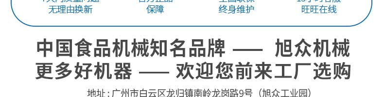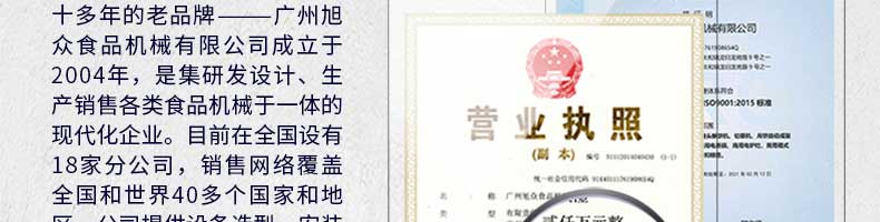 廣州旭眾食品機械有限公司是一家集科研開發(fā),生產(chǎn)設(shè)計,營銷服務(wù)為一體的現(xiàn)代化生產(chǎn)企業(yè)。現(xiàn)代化生產(chǎn)車間,精湛制造技術(shù),所產(chǎn)機械歷經(jīng)市場重重考驗,不斷贏得海內(nèi)外客戶的贊譽。