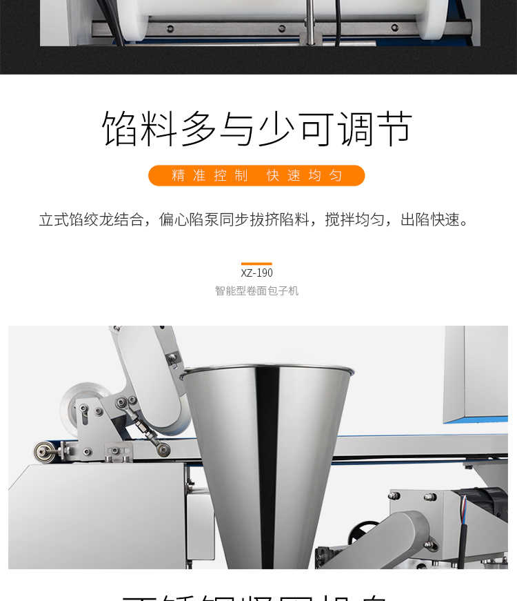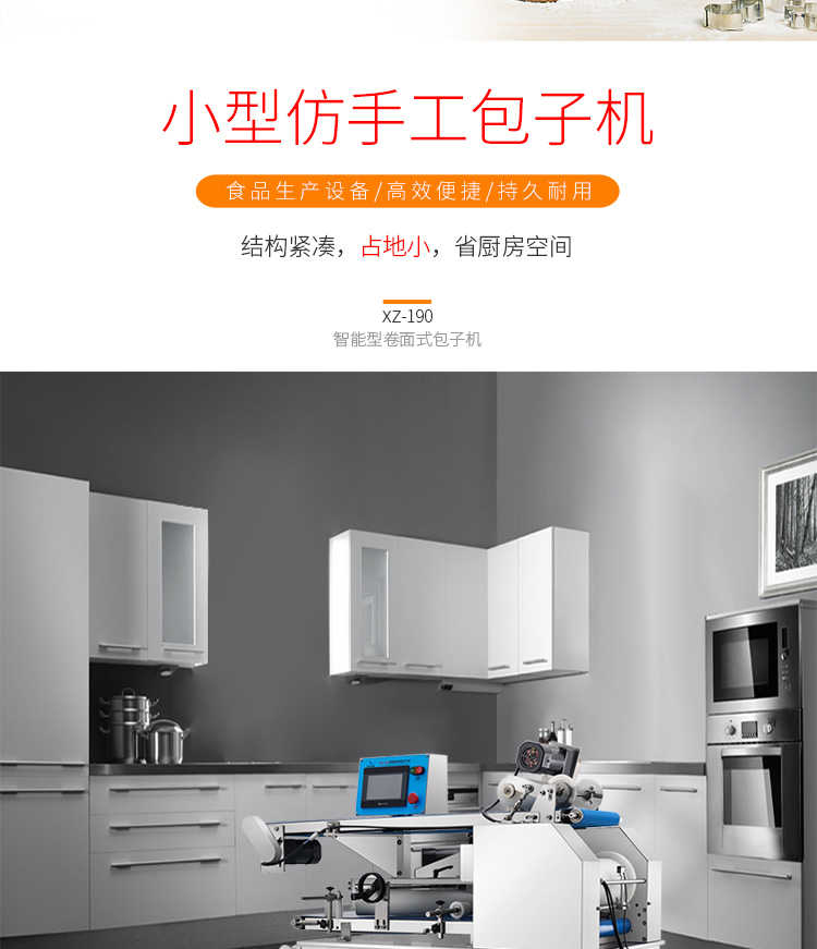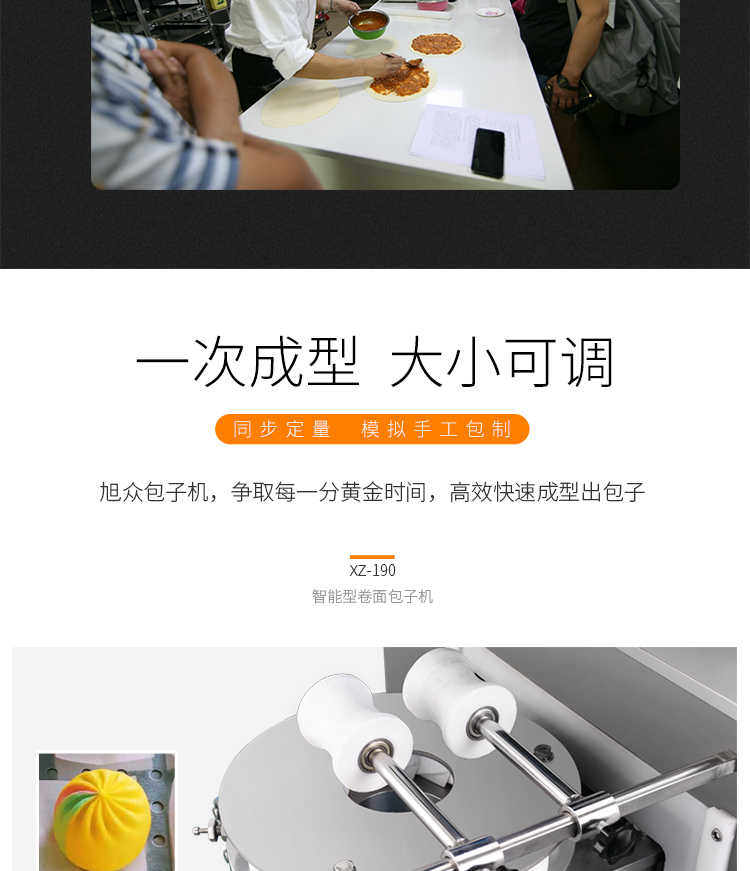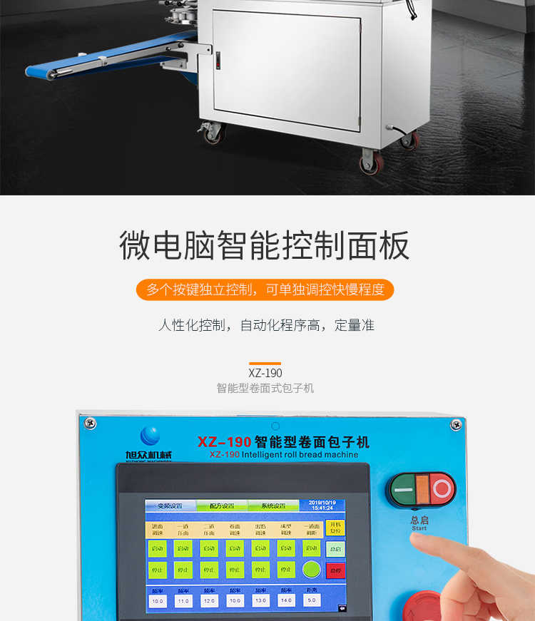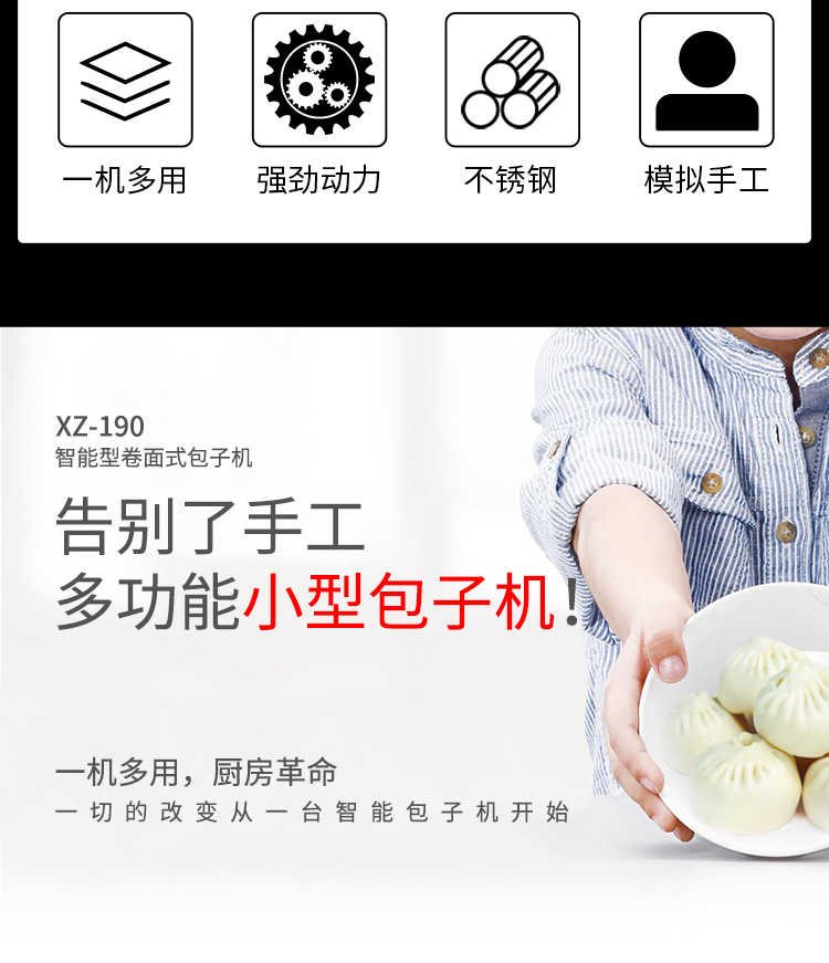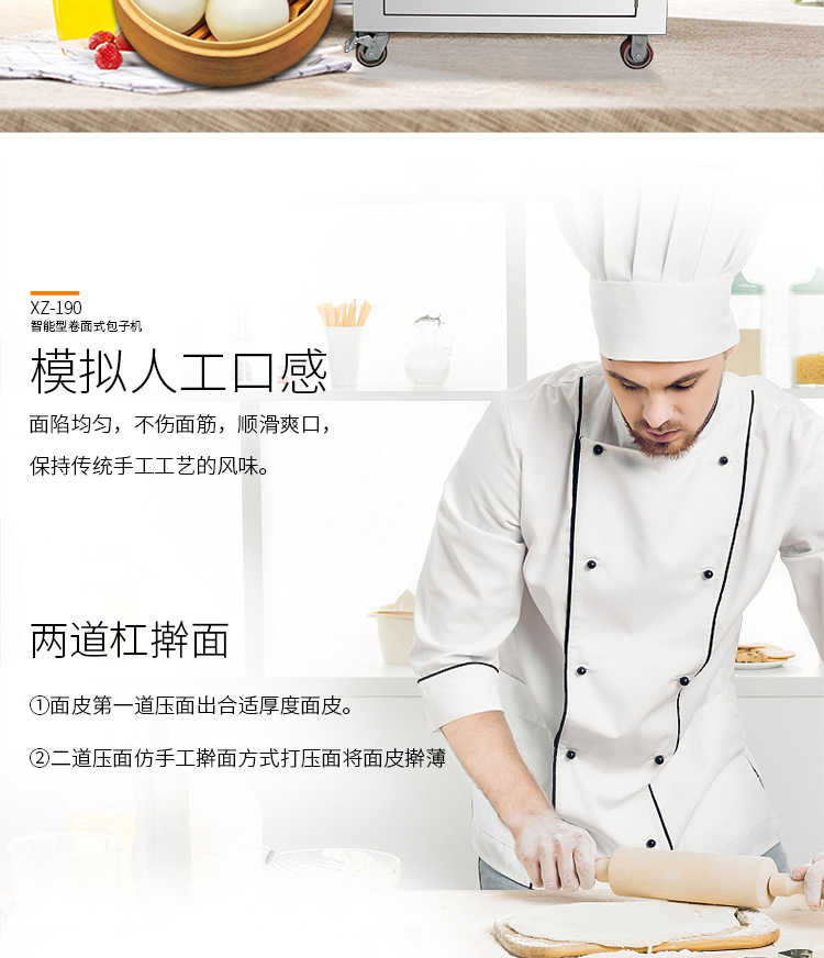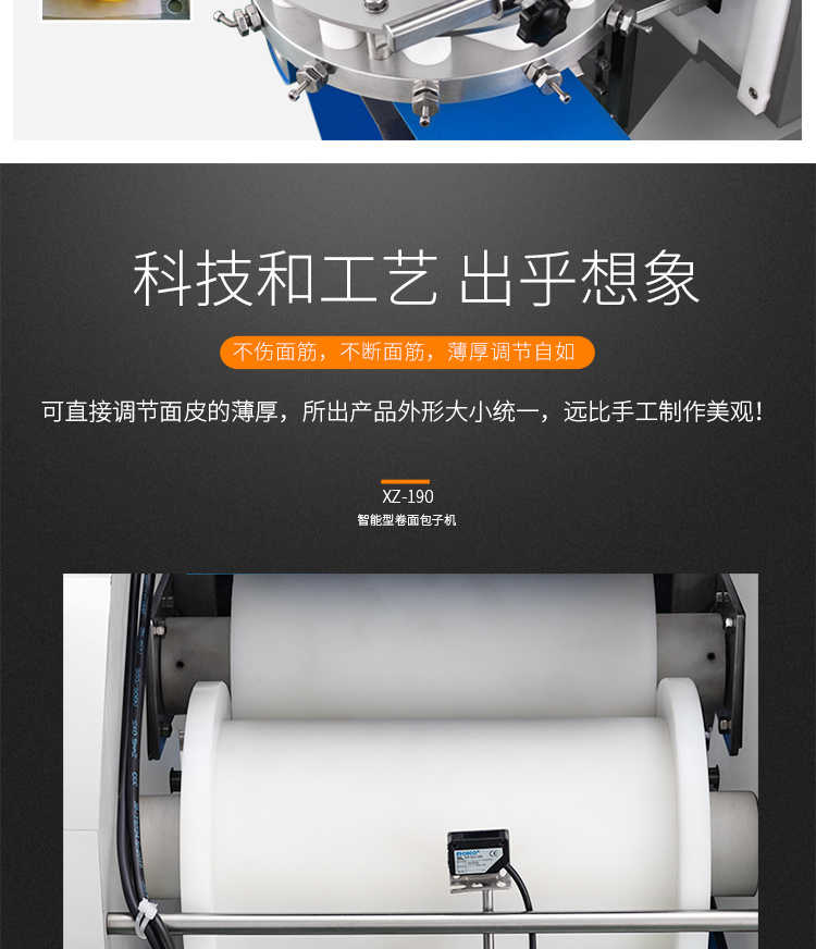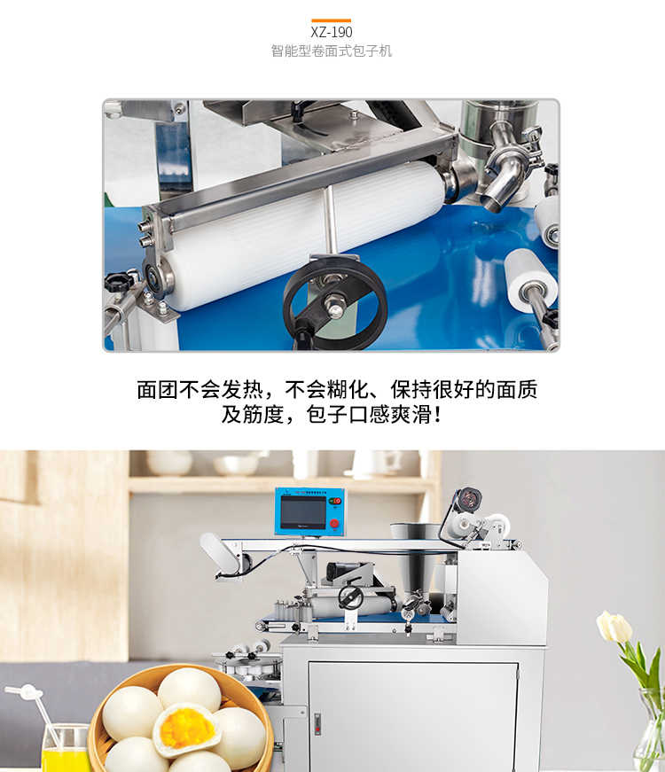 XZ-190智能型卷面式包子機,科技和工藝出乎想象不傷面筋,不斷面筋,薄厚調節自如可直接調節面皮的薄厚,所出產品外形大小統一,遠比手工制作美觀!