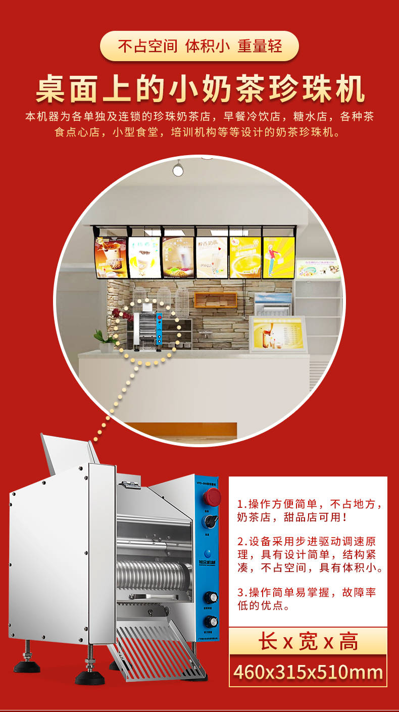 VFD-900珍珠奶茶機,奶茶店、甜品店可用。可生產奶茶珍珠,果蔬圓子,無餡湯圓,水晶湯圓,各種芋圓。不占空間、體積小、重量輕,桌面上的小奶茶珍珠機。告別手工繁瑣的工序,省時省力,輕松解決手工麻煩,成本高等一系列問題
