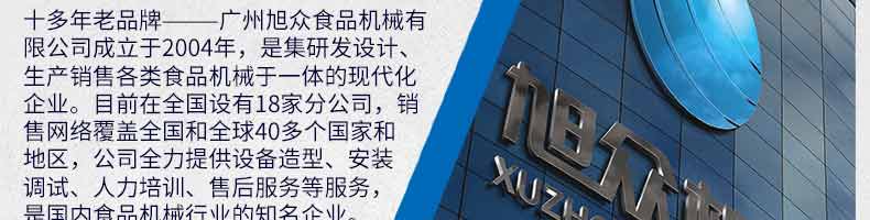 廣州旭眾食品機(jī)械有限公司是一家集科研開(kāi)發(fā),生產(chǎn)設(shè)計(jì),營(yíng)銷服務(wù)為一體的現(xiàn)代化生產(chǎn)企業(yè)。現(xiàn)代化生產(chǎn)車間,精湛制造技術(shù),所產(chǎn)機(jī)械歷經(jīng)市場(chǎng)重重考驗(yàn),不斷贏得海內(nèi)外客戶的贊譽(yù)。