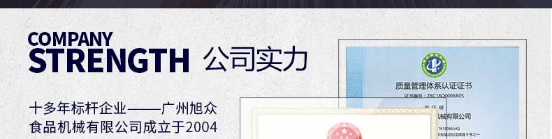 廣州旭眾食品機械有限公司是一家集科研開發,生產設計,營銷服務為一體的現代化生產企業。現代化生產車間,精湛制造技術,所產機械歷經市場重重考驗,不斷贏得海內外客戶的贊譽。