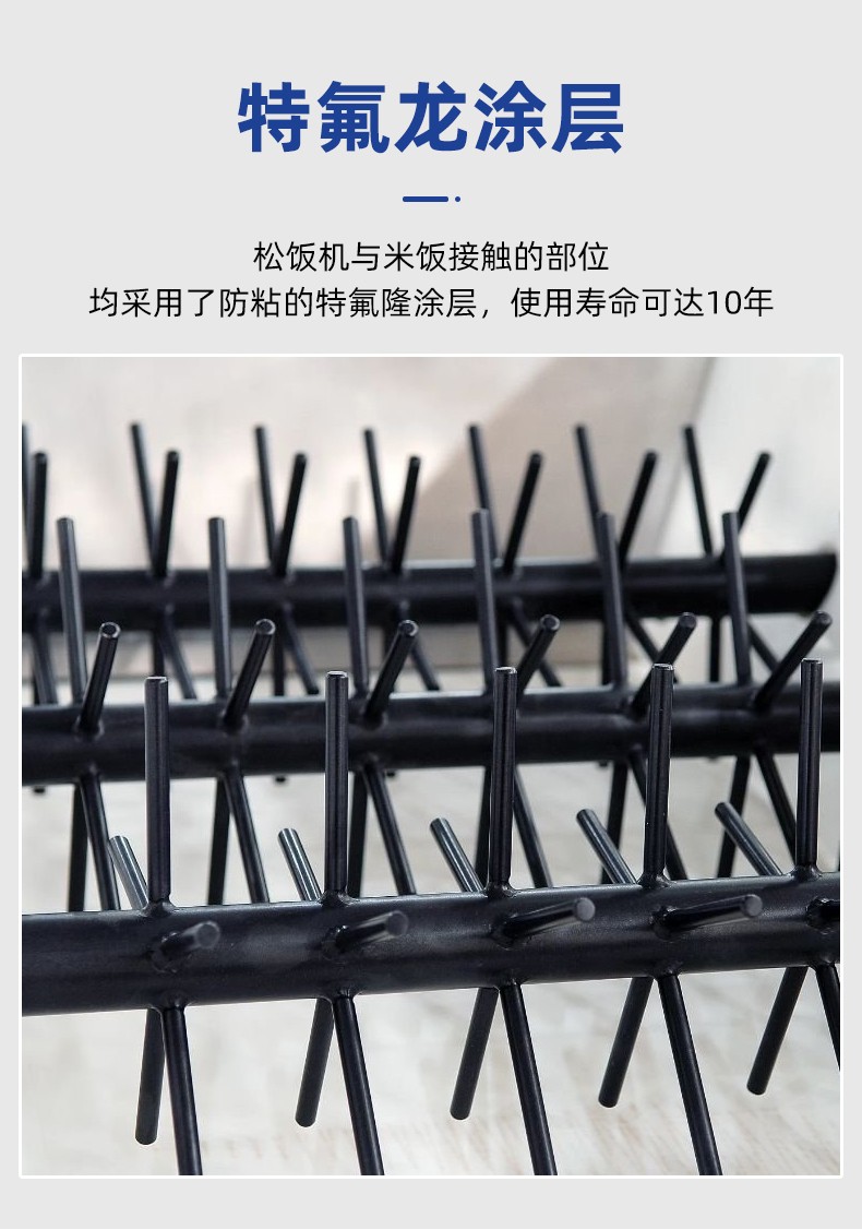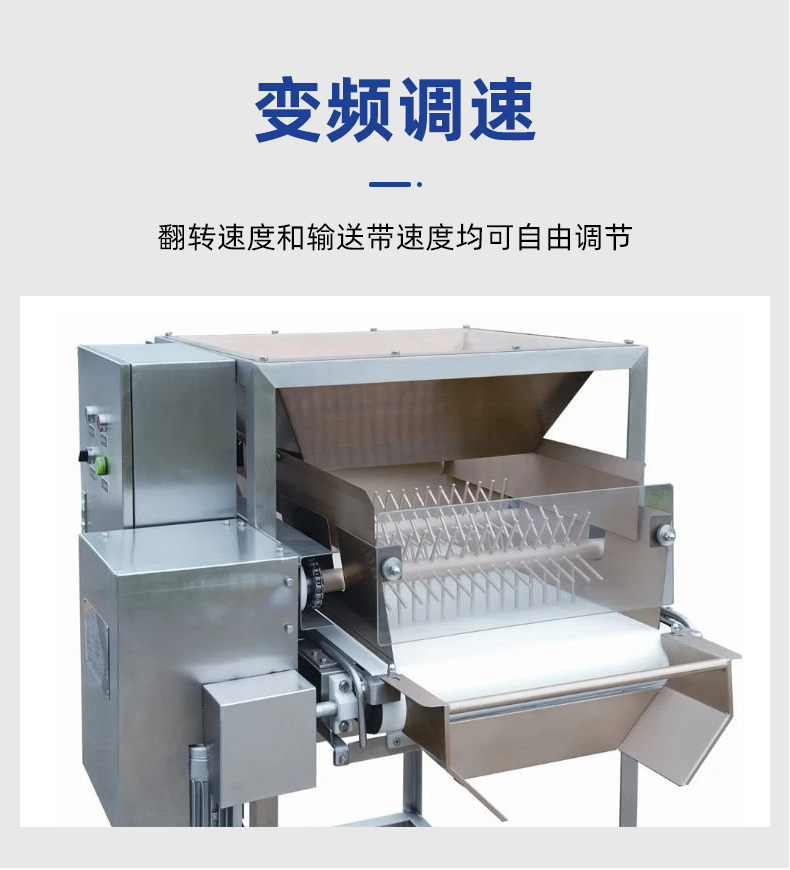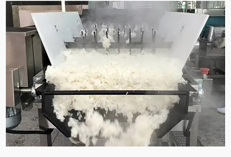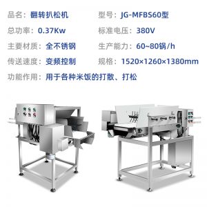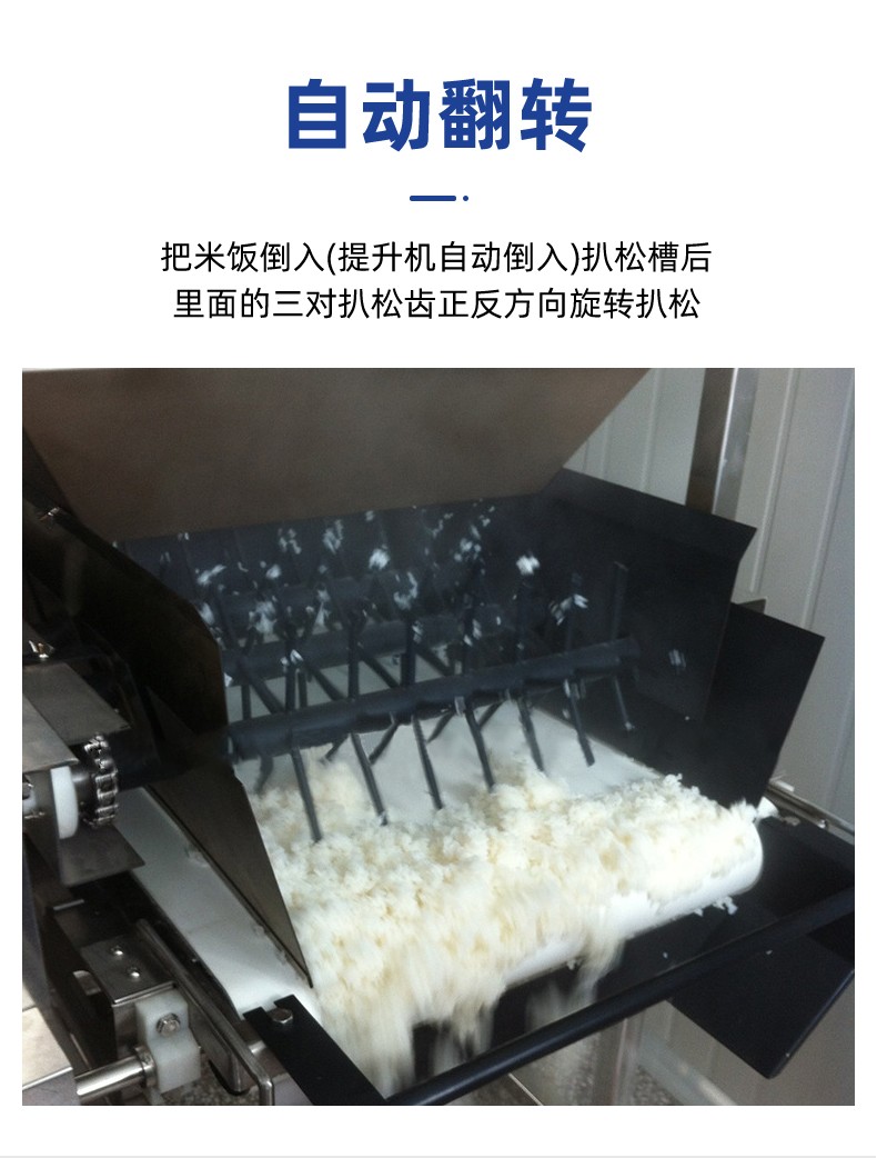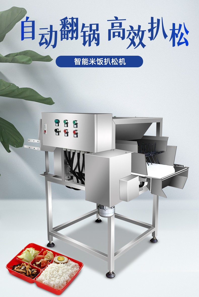 智能米飯扒松機-翻轉扒松機,主要結構:由不銹鋼機架、翻鍋機構、扒松機構輸送機構和電氣自動系統等組成。適用對象:主要用于中央廚房、團膳、企事業單位食堂等