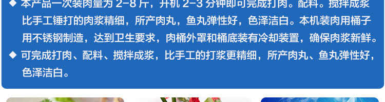 SZ-18型肉丸打漿機,本機裝肉用桶子采用不銹鋼制造,達到衛生要求,肉桶外罩和桶底裝有冷卻裝置,確保肉漿新鮮。比手工的打漿更精細,所產肉丸、魚丸彈性好,色澤潔白。