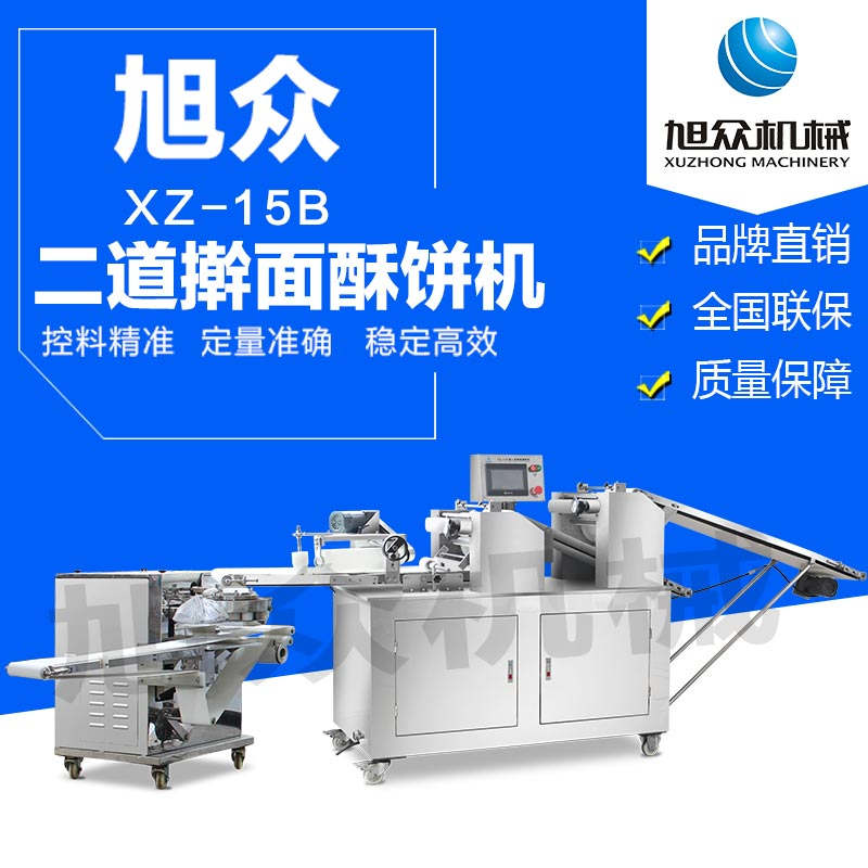 xz-15B二段酥餅機,生產速度快、效率高、生產流程流暢,各環節都輔以精密電控設備控制,不會出現堵面、破酥等現象。可生產蘇式月餅、肉松餅、老婆餅、廈門餡餅、金華酥餅、拉絲面包等等特色酥餅,適用于大、中型糕餅生產廠家,免費提供工藝技術。