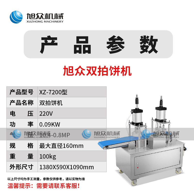 XZ-7200型雙拍餅機,雙氣缸雙拍餅機雙氣缸分兩次拍扁,大大提高了產品的優良性;拍的更均勻平整。搭配酥餅杋、月餅機、糍粑機使用。告別手工、更高效率。讓拍餅機改變生活,降低手工成本,省去繁瑣的手工工序,提高生活品質。