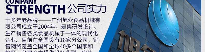 廣州旭眾食品機械有限公司是一家集科研開發,生產設計,營銷服務為一體的現代化生產企業。現代化生產車間,精湛制造技術,所產機械歷經市場重重考驗,不斷贏得海內外客戶的贊譽。