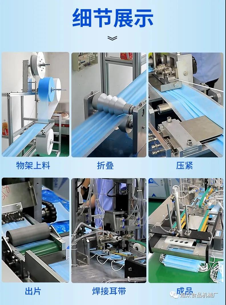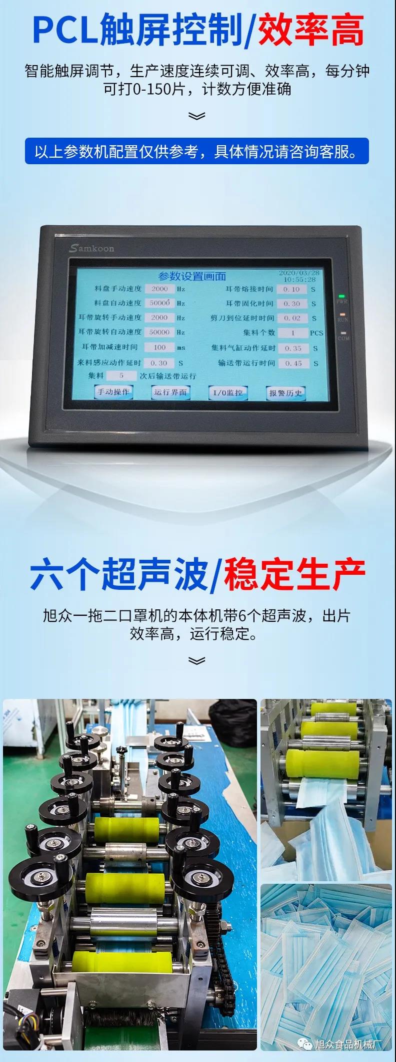 旭眾牌一拖二口罩機由一臺本體機帶動兩臺耳帶機組成。本體機輸出ロ罩本體后,由輸送帶結(jié)構將口罩本體片輸送到連接耳帶機的輸送帶上,再通過輸送帶將口罩片輸送到耳帶機的正面第一個口罩盤上方,最后通過氣缸下壓把口罩片放置到耳帶機的口罩盤內(nèi),后續(xù)由耳帶機完成口罩的耳帶熔接,包邊等動作,從而完成一個耳帶口罩產(chǎn)品的生產(chǎn)。本機采用PLC、觸摸屏控制、主傳送帶采用單相馬達輸送、步進馬達翻轉(zhuǎn),傳動精確,控制穩(wěn)定,速度可調(diào)。