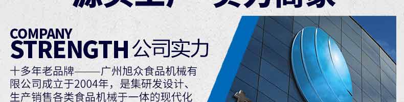 廣州旭眾食品機(jī)械有限公司是一家集科研開發(fā),生產(chǎn)設(shè)計(jì),營銷服務(wù)為一體的現(xiàn)代化生產(chǎn)企業(yè)。現(xiàn)代化生產(chǎn)車間,精湛制造技術(shù),所產(chǎn)機(jī)械歷經(jīng)市場(chǎng)重重考驗(yàn),不斷贏得海內(nèi)外客戶的贊譽(yù)。